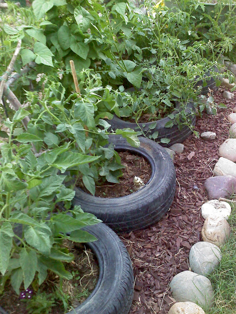 This is the first time I have grown Tomato's in tires. I tried to spruce up the area so it wouldnt look to junk yard like. I put a couple poles in with the Pink Brandywines and left the sweet 100's cherry Tomatos to do what they want. We will see how well the tires do!